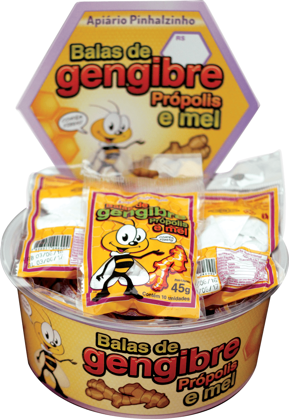Balas de Gengibre, Própolis e Mel do Apiário Pinhalzinho são balas que unem todos benefícios do gengibre, própolis e mel, oferecendo ação bactericida e melhora no desempenho do sistema circulatório, ajudando nas dores de garganta e nos resfriados.
