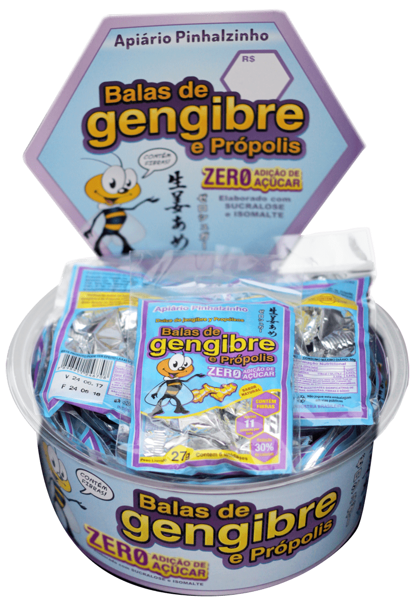 Balas de Gengibre e Própolis do Apiário Pinhalzinho são balas que unem todos benefícios do gengibre e própolis oferecendo ação bactericida e melhora no desempenho do sistema circulatório, ajudando nas dores de garganta e nos resfriados.